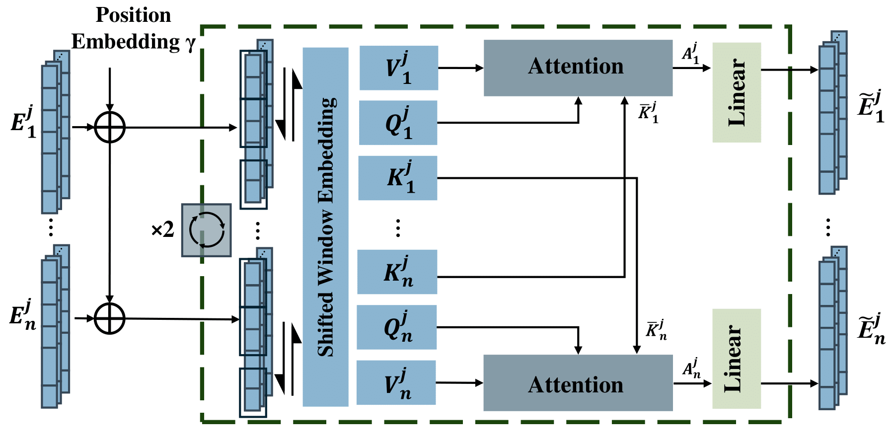 Efficient cross-View Attention (EVA) module for 3D Gaussian position estimation. EVA takes multi-view image features as input, embeds them into window patches using a shifted algorithm, and performs cross-view attention between the features from different views.