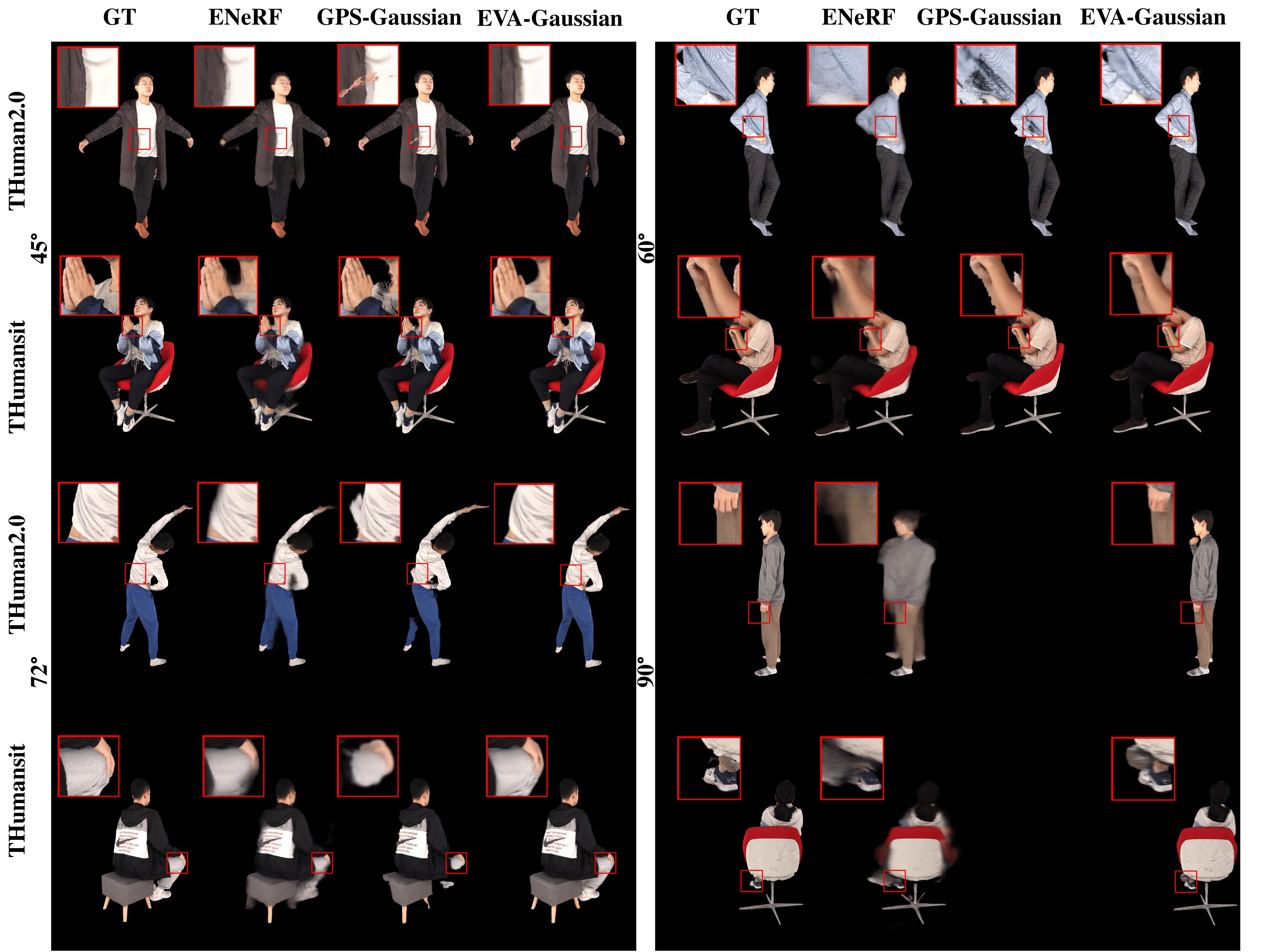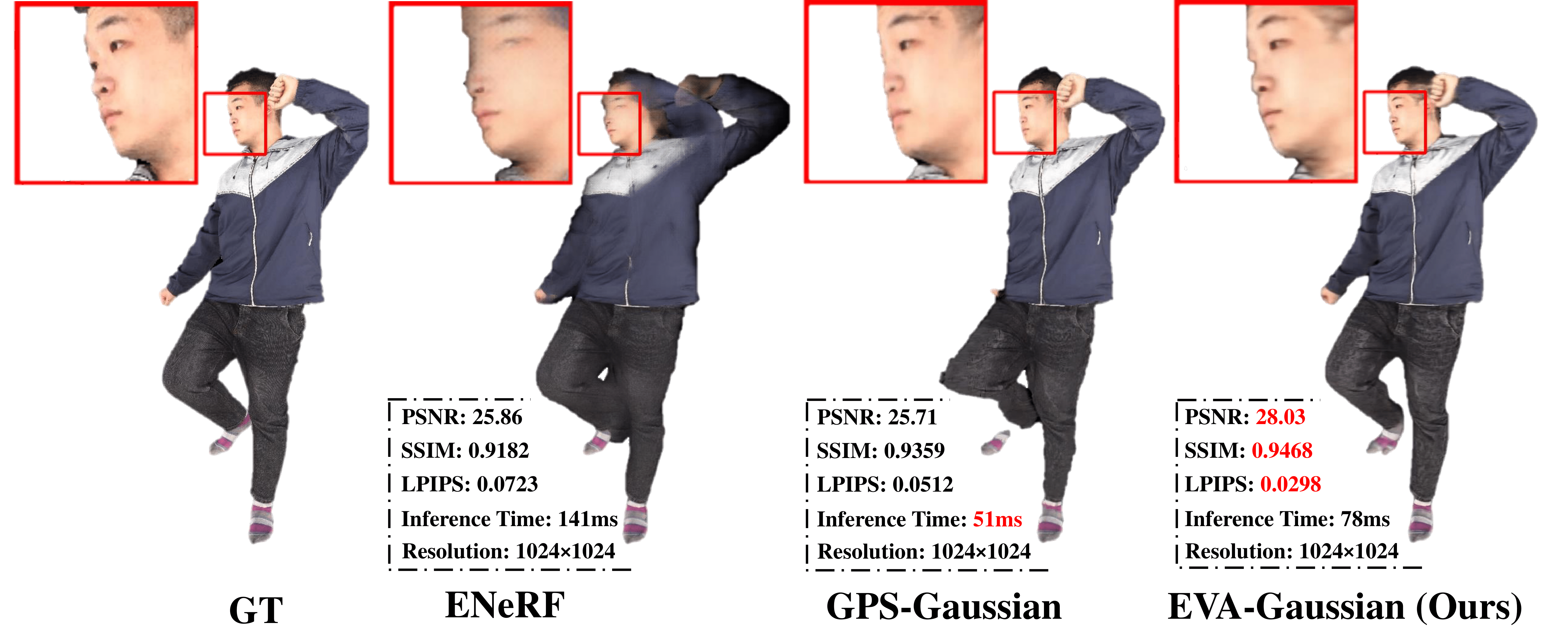 We propose a three-stage pipeline named EVA-Gaussian for 3D human novel view synthesis across diverse camera settings. Specifically, we first introduce an Efficient cross-View Attention (EVA) module to accurately estimate the position of each 3D Gaussian from the source images. Then, we integrate the source images with the estimated Gaussian position map to predict the attributes and feature embeddings of the 3D Gaussians. Finally, we employ a recurrent feature refiner to correct artifacts caused by geometric errors in position estimation and enhance visual fidelity. To further improve synthesis quality, we incorporate a powerful anchor loss function for both 3D Gaussian attributes and human face landmarks. Experimental results on the THuman2.0 and THumansit datasets showcase the superiority of our EVA-Gaussian approach in rendering quality across diverse camera settings.