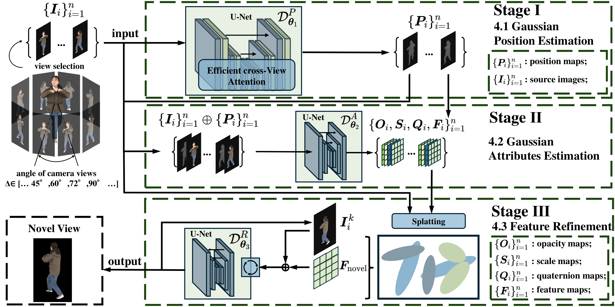Overview of EVA-Gaussian. EVA-Gaussian takes sparse-view images captured around a human subject as input and performs three key stages: (1) estimating the positions of 3D Gaussians, (2) inferring the remaining attributes (i.e., opacities, scales, quaternions, and features) of these Gaussians, and (3) refining the output image in a recurrent manner